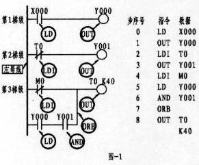第3梯級;左邊第一個觸點為常閉,上標為M0, M為輔助繼電器(該繼電器有多種,注意類別),其指令的正確表示應為:4、LDI  M0(如程序所示)。本梯級的第2行第一個觸點為常開,上標為Y000,Y表示輸出繼電器,由于該觸點與后面Y001觸點呈串聯關系,形成了所謂的電路"塊",故而其觸點的指令應為 5、LD  Y000??傊甃D與LDI指令從上面可以看出,它們均是左母線每一梯級第一觸點所使用的指令。而梯級中的支路(即第3梯級的第2行)有二個或二個以上觸點呈串聯關系,其第一觸點同樣按LD或LDI指令??墒褂肔D、LDI指令的元件有:輸入繼電器X、輸出繼電器Y、輔助繼電器M、定時器T、計數器C、狀態繼電器S。OUT為線圈驅動指令,該指令不能出現在左母線第一位。驅動線圈與驅動線圈不能串聯,但可并聯。同一驅動線圈只能出現一次,并安排在每一梯級的最后一位。如上圖中的1、OUT  Y000,3、OUT  Y001,Y為輸出繼電器,其線圈一旦接獲輸出信號,可以這樣認為,線圈將驅動其相應的觸點而接通外部負載(外部負載多為接觸器、中間繼電器等)。而上圖8、OUT  T0  K40 為定時器驅動線圈指令,其中的K為常數40為設定值(類似電工對時間繼電器的整定)。可使用OUT指令元件有:輸出繼電器Y、輔助繼電器M、定時器T、計數器C、狀態繼電器S。