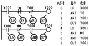 可以看出上圖的X000、X001、M0三者處于并聯關系。由于X000下面二條支路均為單個觸點,因X001是常開觸點,故用OR指令。而M0是常閉觸點,則用ORI指令。三接點并聯后又與M1串聯,串聯后又與Y000并聯,而Y000也是單個觸點,所以仍采用OR指令。可使用OR、ORI指令元件有:輸入繼電器X、輸出繼電器Y、輔助繼電器M、定時器T、計數器C、狀態繼電器S。