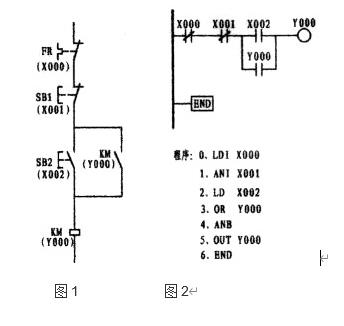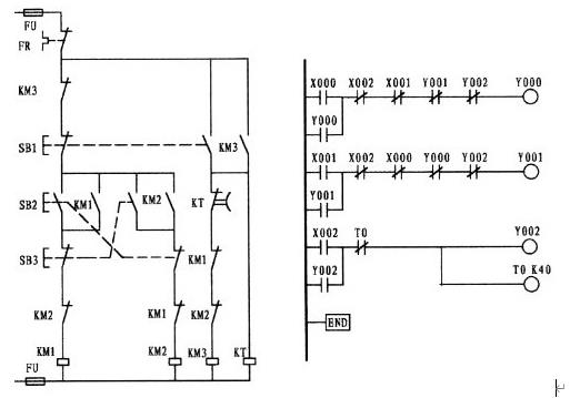 上圖的圖1為電原理圖,圖2則為按與原理圖一一對應的原則編繪的梯形圖,其特點是易于理解,但在我的印象中沒有幾張是可以這樣繪制的。如果采用這樣的方法繪制的話,將有可能走入不歸路。盡管二個圖都可運行,但如果將圖2加以改變而成為圖3 ,可以看出圖3在程序上少了一個步序ANB。簡潔明了是編程的要素。故而在編繪梯形圖時應盡量地將多觸頭并聯觸頭放置在梯形圖的母線一側可減少ANB指令。圖2中的X000、圖3中的X002均為外接熱繼電器所控制的常閉接點,而熱繼電器則用常開接點(或也可將外部的熱繼電器的常閉觸頭與接觸器線圈相串聯)。只有在畫出梯形圖后,再根據梯形圖編出程序。
